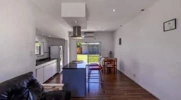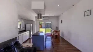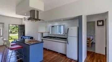 - Cocina con muebles bajo mesada y barra desayunadora integrada al living comedor, con salida al jardín.